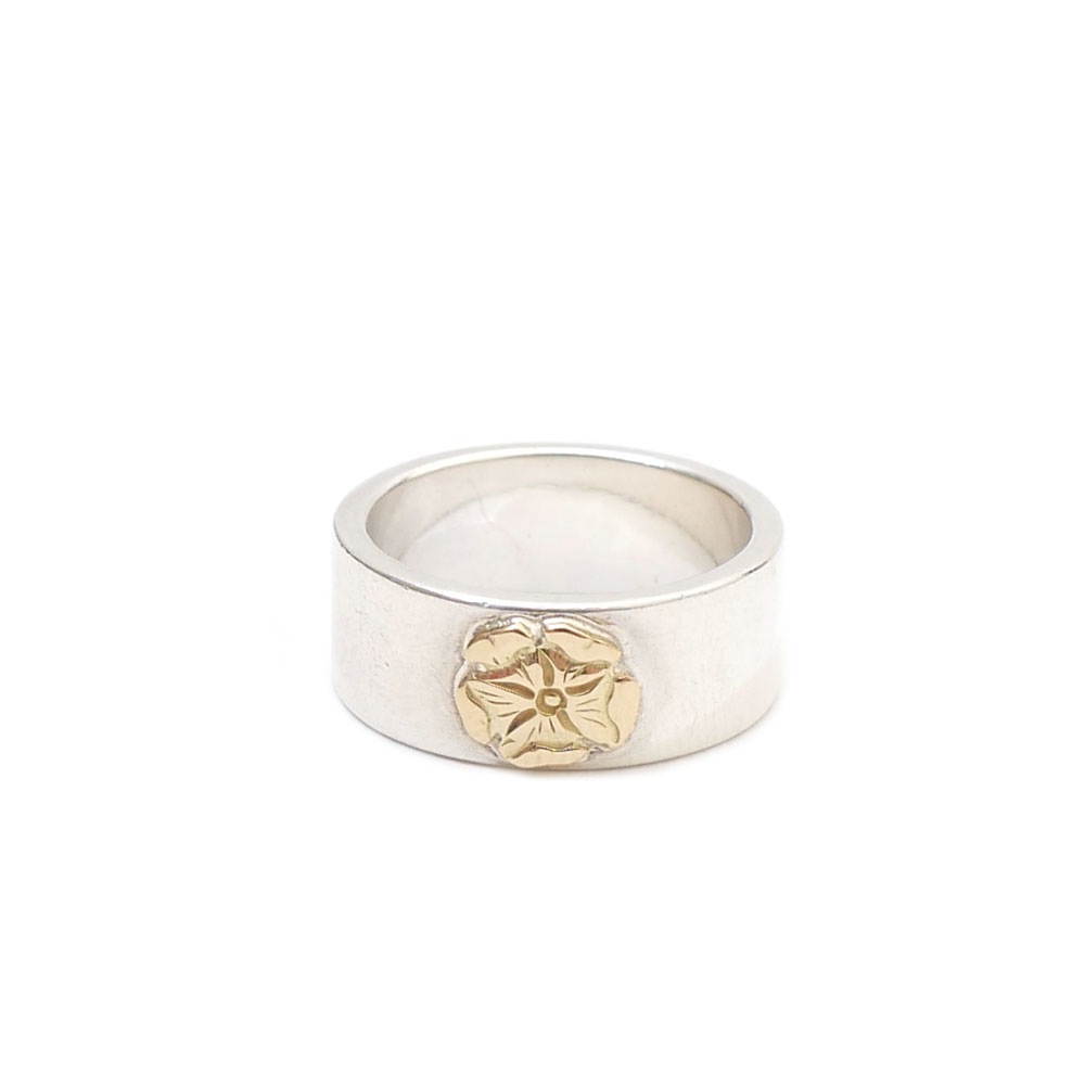 中央にK18製ローズを装飾したリングです!使い続けることで経年劣化によってシルバーとゴールドの陰影が深まり、味わい深いカラーリングに変化していきます。大量生産では作ることが出来ない魂が込められた渾身の一品!
