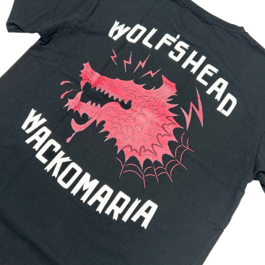 スタッズを使ったオリジナルのレザーベルトやリストバンドなどアクセサリーが人気のウルフズヘッドとワコマリアのコラボレーションによるTシャツです。ウルフズヘッドらしいインパクトのあるグラフィックがバックに大きく入る一枚です◎