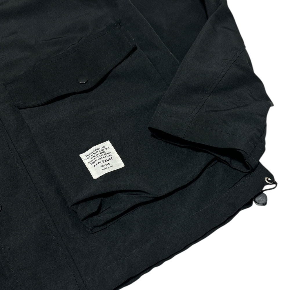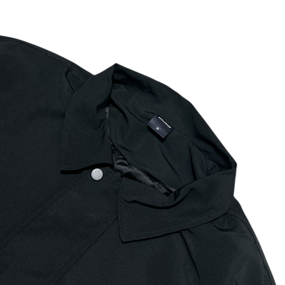 APPLEBUMの光沢のあるポリエステル生地で仕上げたジャケットです。裏地のサテン素材も高級感があり、フロントに大きめのポケットとブランドのタグが付いたシンプルでコーディネートしやすい一着です◎